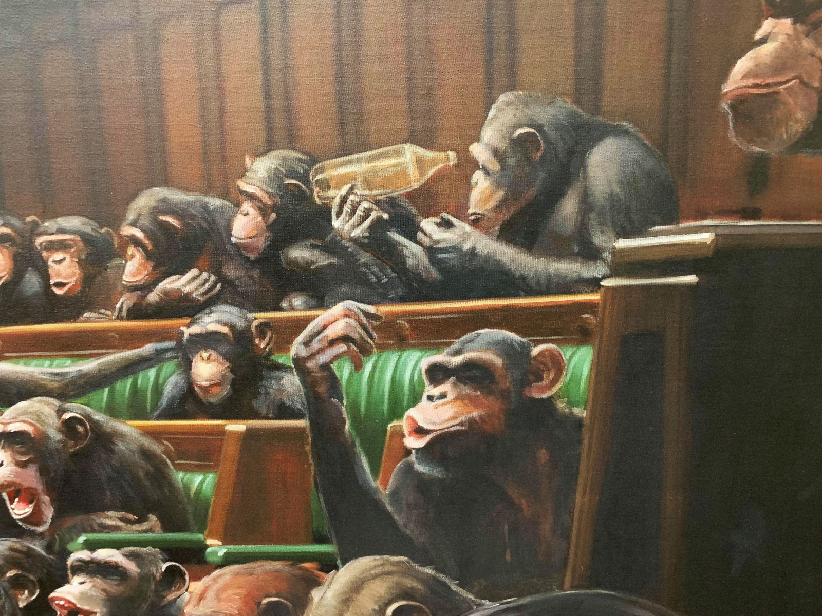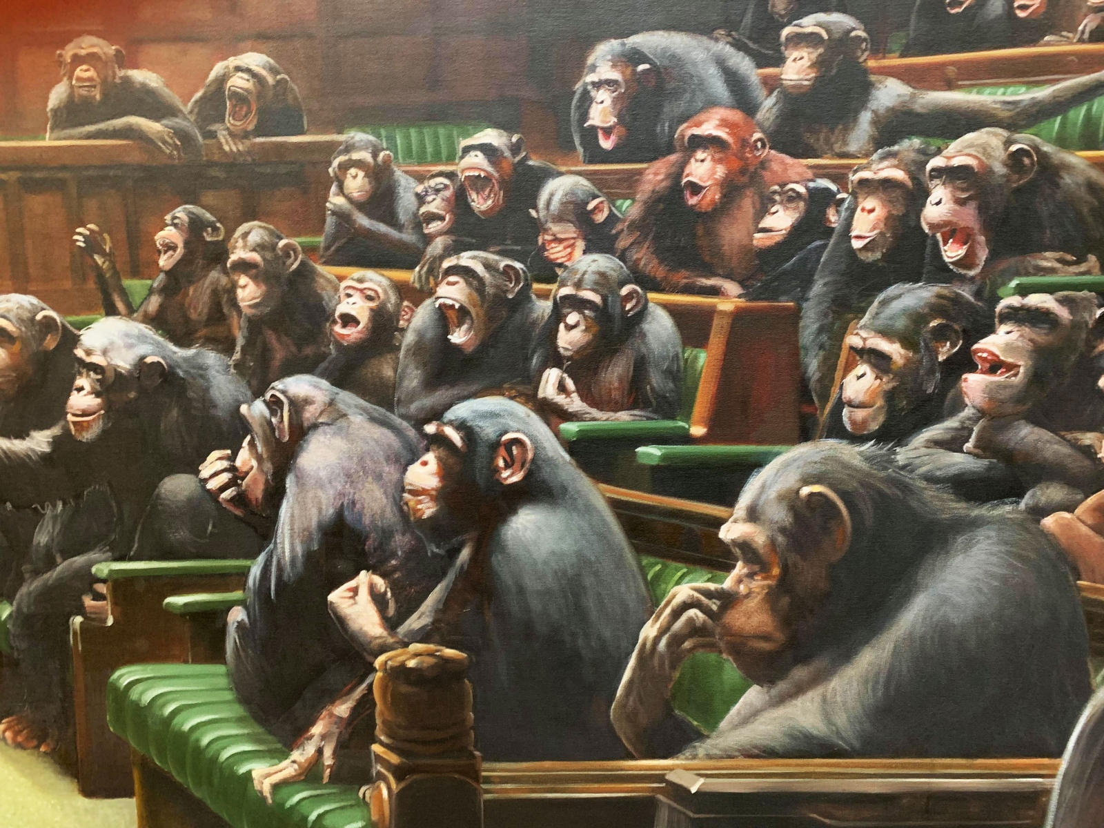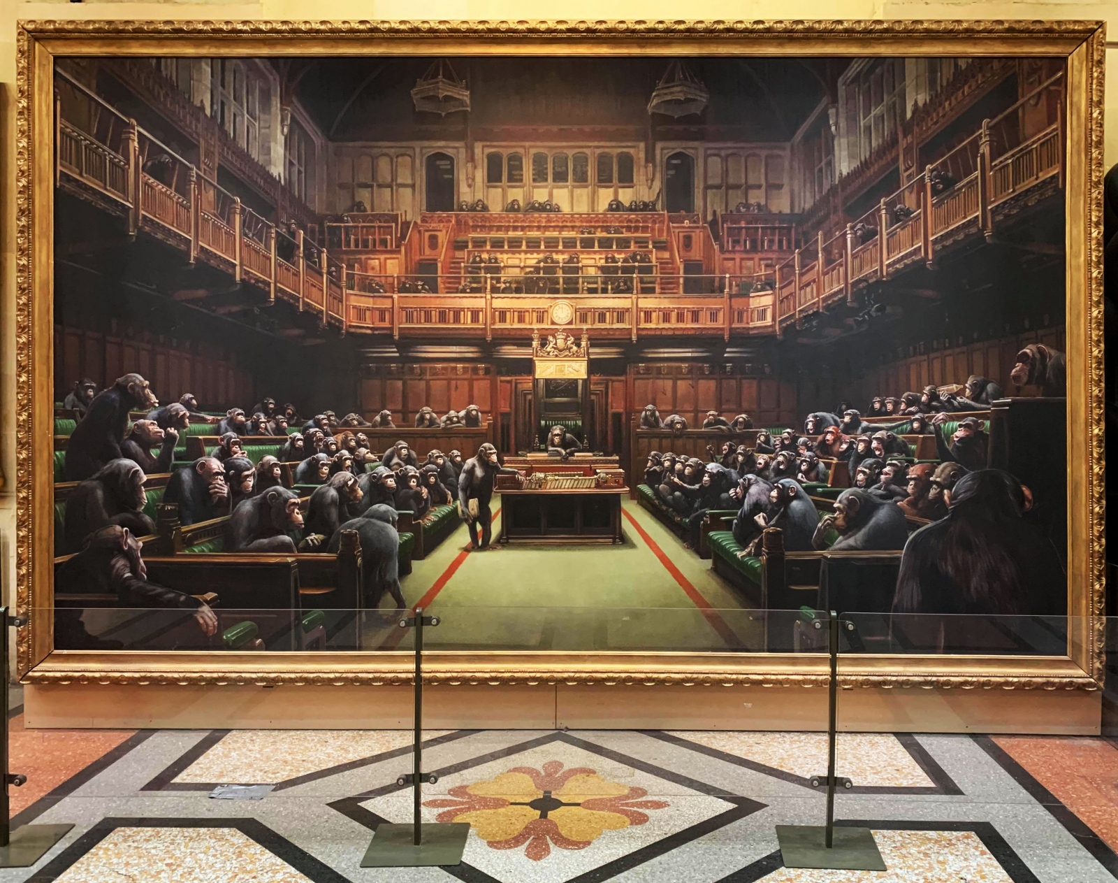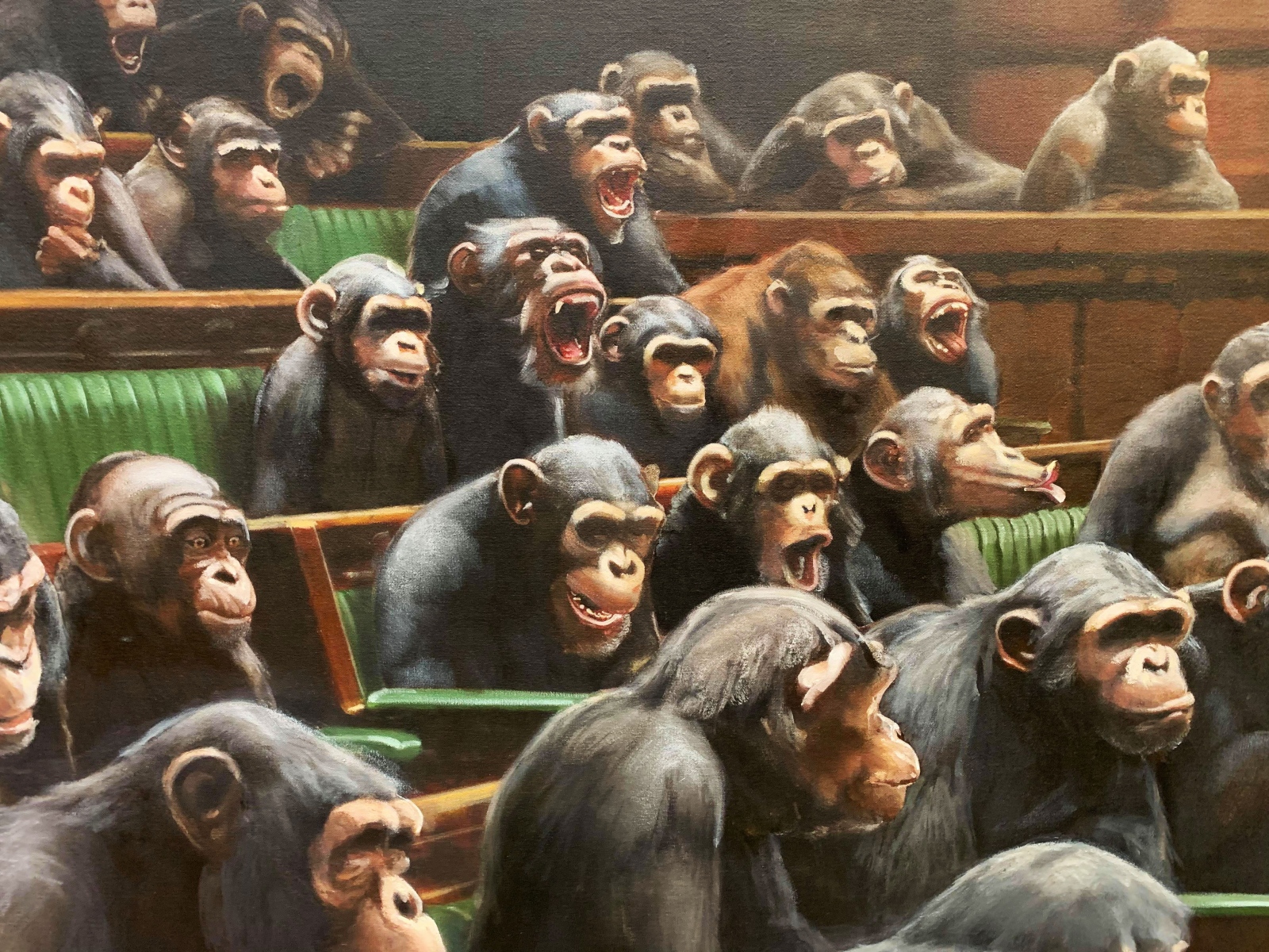 “Devolved Parliament” depicts the houses of Parliament with chimpanzees instead of people. It is Banksy’s largest known piece, at 4 meters wide and 2.5 meters high.
